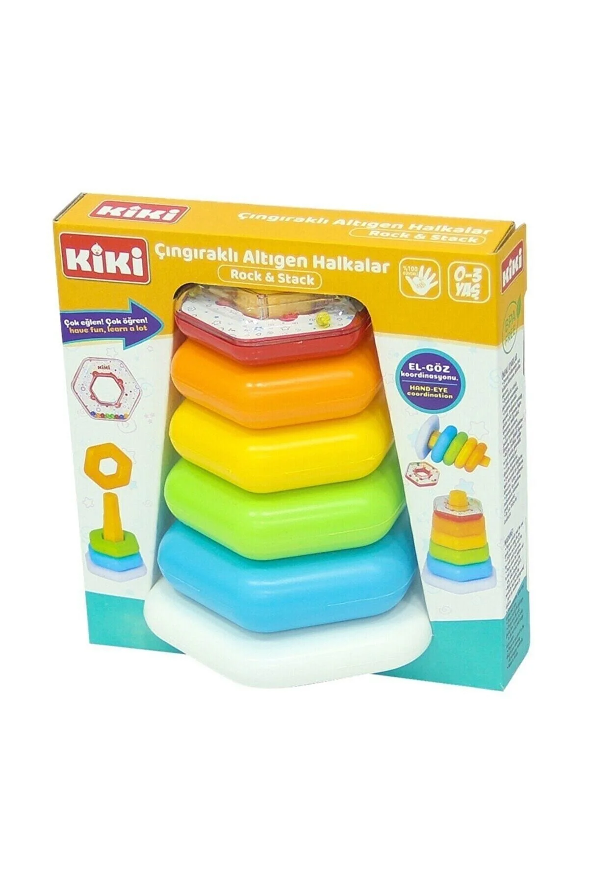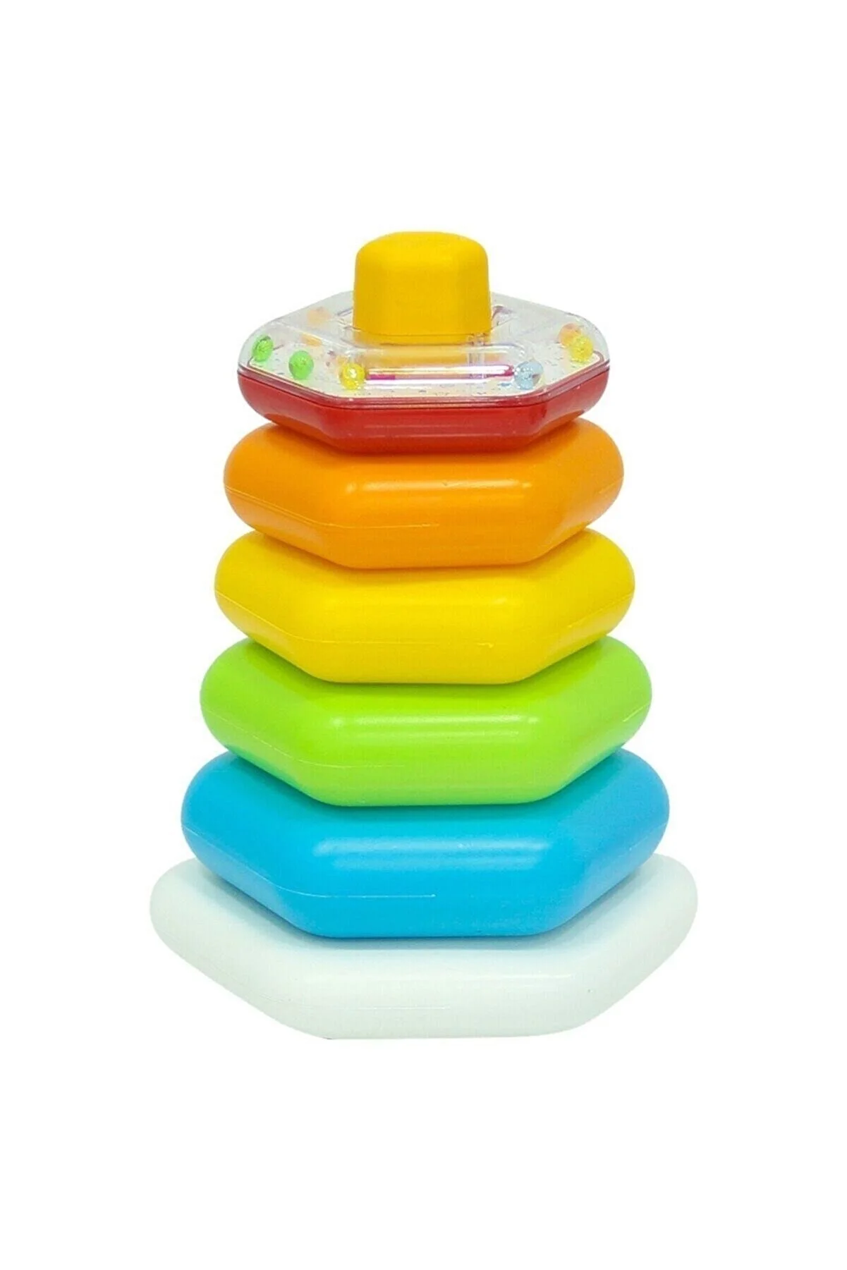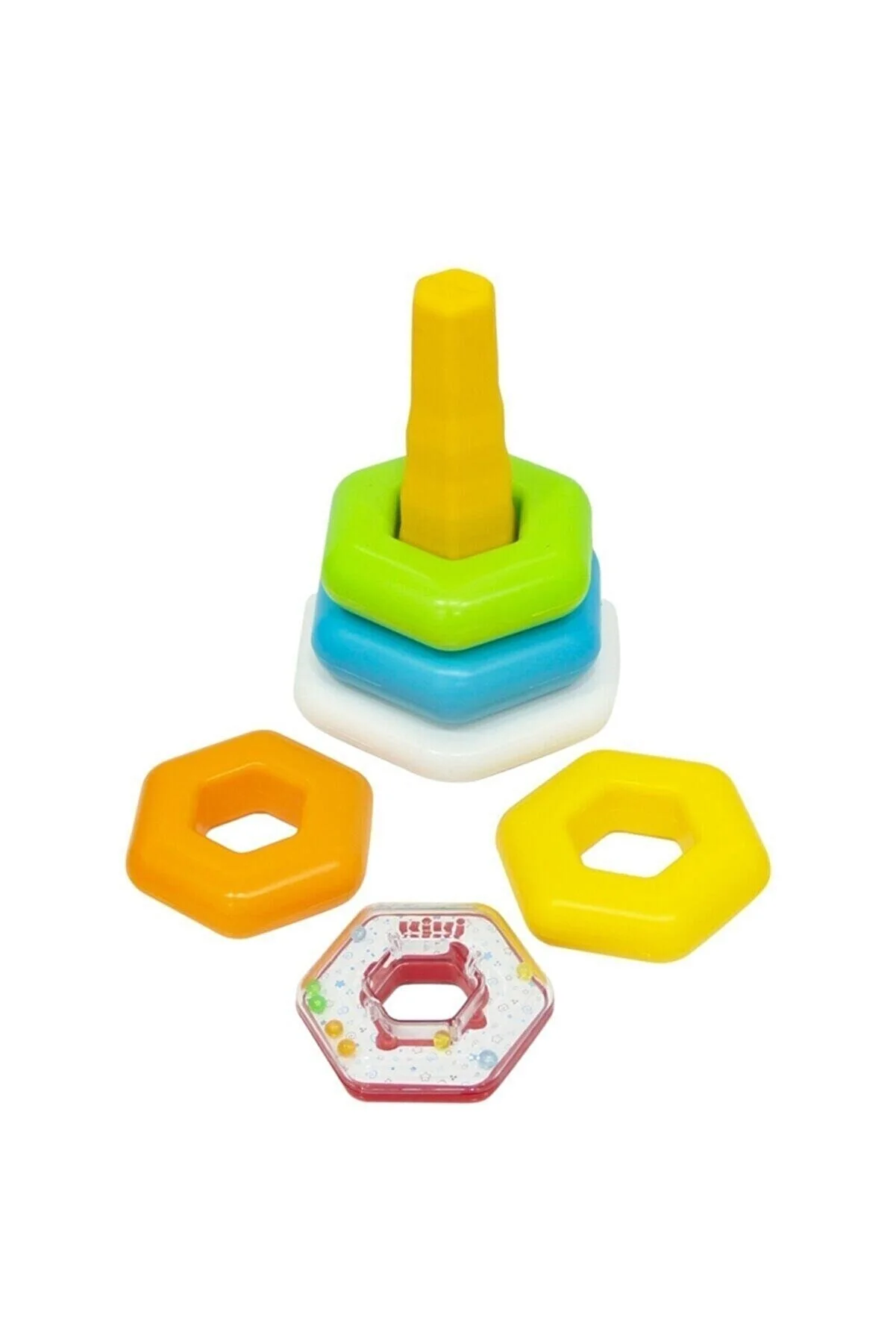 حلقه های شش ضلعی رنگارنگ: 5 حلقه شش گوش در رنگ های مختلف و اندازه های مختلف که 1 عدد آن دارای مهره هایی است که با تکان دادن صدا ایجاد می کند، می توانید از آن به عنوان جغجغه نیز استفاده کنید. کوچولوها